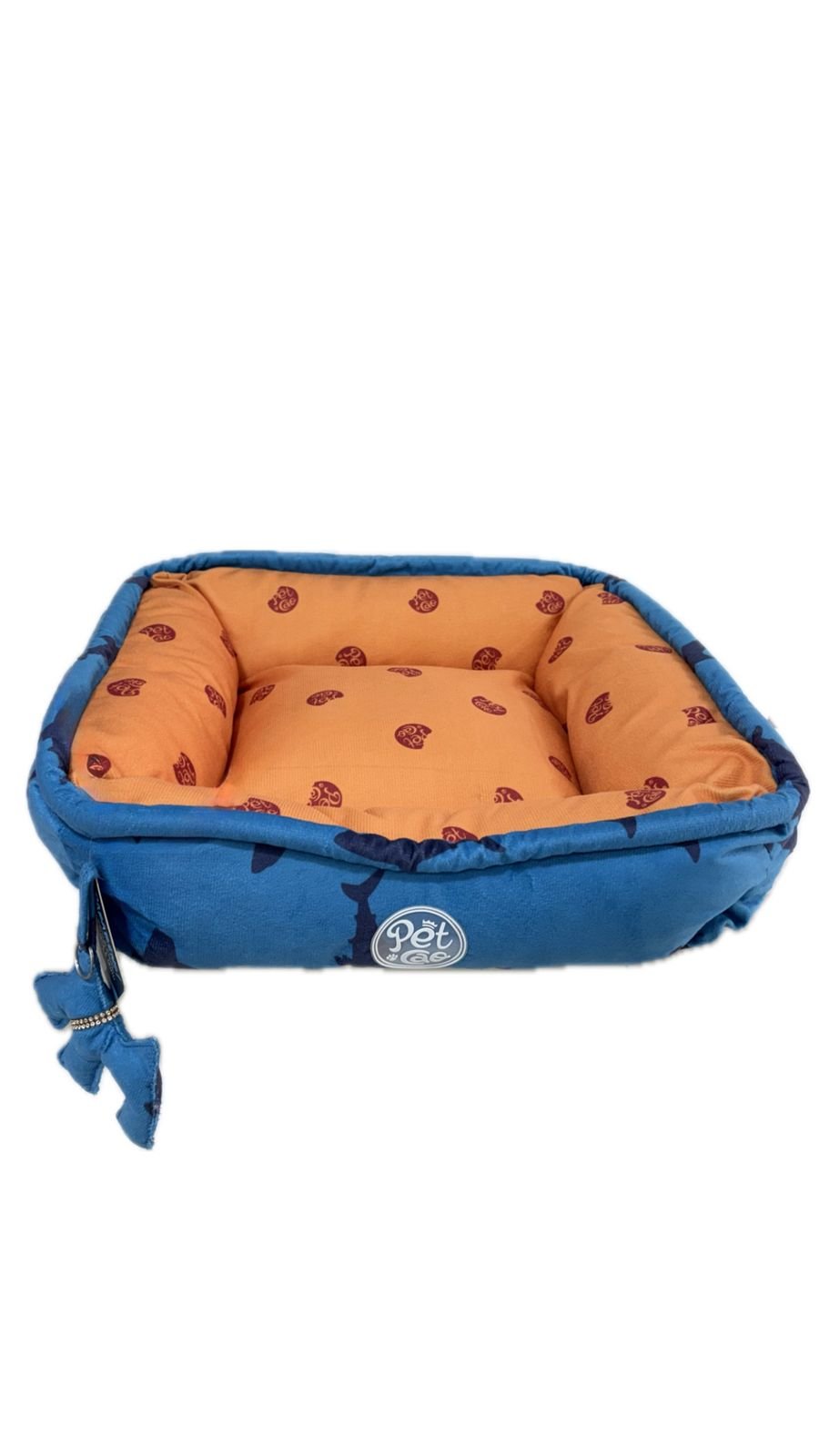 Lúdico e Premium. Esta é uma peça cheia de personalidade, com um contraste vibrante entre o azul externo e o laranja suave do interior. Decorada com estampas de patinhas e o selo de qualidade “Pet Cão”, ela ainda conta com um detalhe especial: um pingente em formato de cachorro. É a cama ideal para pets cheios de energia e donos que não abrem mão de exclusividade.