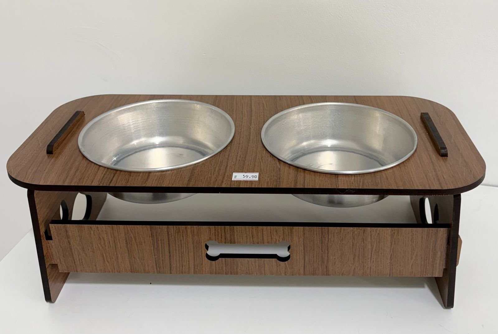 Comedouro Duplo Elevado para Pets em Madeira – Modelo Retangular com Tigelas de Alumínio