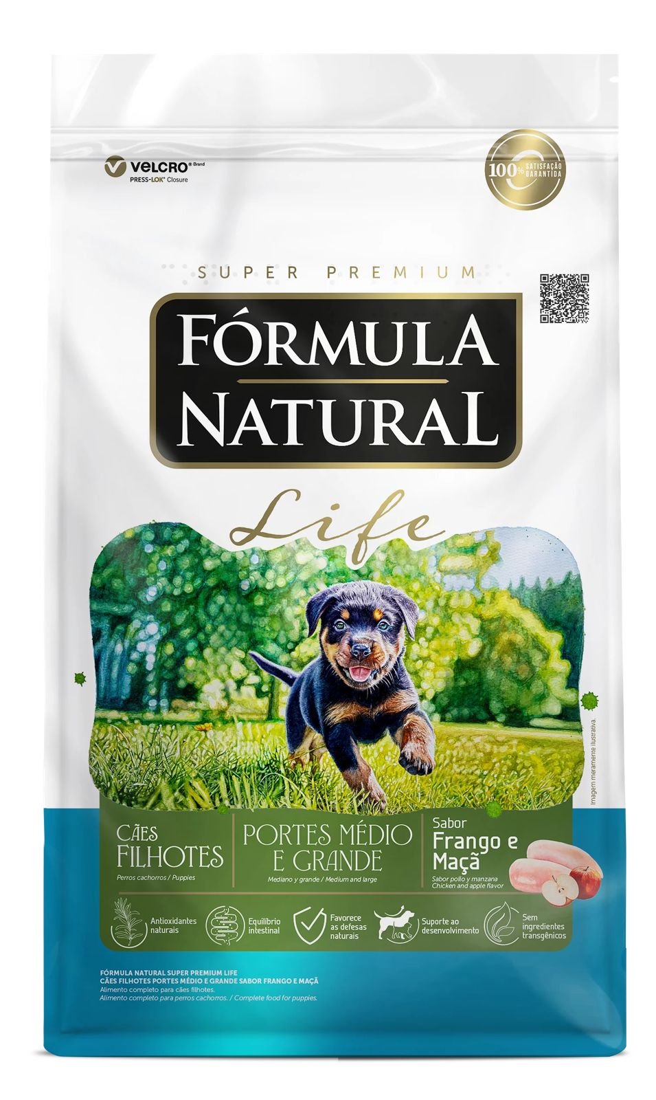 Farinha de vísceras de aves, quirera de arroz, farelo de trigo, farinha de torresmo, grão de linhaça, polpa de beterraba, frutas e vegetais desidratados (manga, maçã e cenoura), óleo de aves, óleo refinado de peixe, hidrolisado de fígado de aves e suíno, cloreto de sódio, cloreto de potássio, biomassa de microalgas (Schizochytrium sp.), parede celular de levedura, frutooligossacarídeos, inulina, zeolita, extrato de yucca (0,04%), sulfato de condroitina (0,01%), sulfato de glicosamina (0,03%), vitaminas (A, D3, E, K3, B1, B2, B5, B6, B12, C, niacina, ácido fólico, biotina, cloreto de colina), minerais (sulfato de ferro, sulfato de cobre, sulfato de manganês, sulfato de zinco, iodato de cálcio, selenito de sódio, organozinco, organosselênio, organomanganês), hexametafosfato de sódio, ácido propiônico, extratos de alecrim, chá verde e hortelã, concentrado de tocoferóis (0,01%).