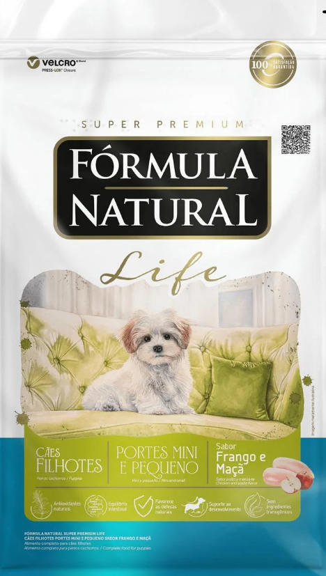 Farinha de vísceras de aves, quirera de arroz, farelo de trigo, farinha de torresmo, grão de linhaça, polpa de beterraba, fAdicionar novo produtorutas e vegetais desidratados (manga, maçã e cenoura), óleo de aves, óleo refinado de peixe, hidrolisado de fígado de aves e suíno, cloreto de sódio, cloreto de potássio, biomassa de microalgas (Schizochytrium sp.), parede celular de levedura, frutooligossacarídeos, inulina, zeolita, extrato de yucca (0,04%), sulfato de condroitina (0,01%), sulfato de glicosamina (0,03%), vitaminas (A, D3, E, K3, B1, B2, B5, B6, B12, C, niacina, ácido fólico, biotina, cloreto de colina), minerais (sulfato de ferro, sulfato de cobre, sulfato de manganês, sulfato de zinco, iodato de cálcio, selenito de sódio, organozinco, organosselênio, organomanganês), hexametafosfato de sódio, ácido propiônico, extratos de alecrim, chá verde e hortelã, concentrado de tocoferóis (0,01%).