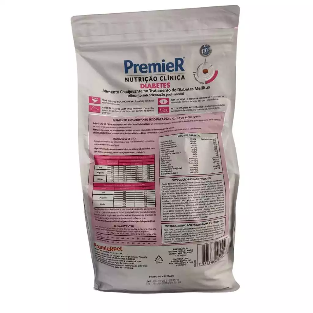 Ração Premier Cães Adultos Nutrição Clínica Diabetes Raças Pequenas é um alimento auxiliar ao tratamento da diabetes mellitus em cães adultos de porte pequeno. Ainda auxilia no controle glicêmico através de alimentos ricos como ervilha, cevada e combinações de fibras que contribuem para a digestão lenta. A Ração Premier Nutrição Clínica além de contar com proteínas e gorduras moderadas que auxiliam na manutenção da massa muscular e peso corporal, se beneficiando de EPA, DHA e antioxidantes que combatem os radicais livres e na modulação das reações inflamatórias.