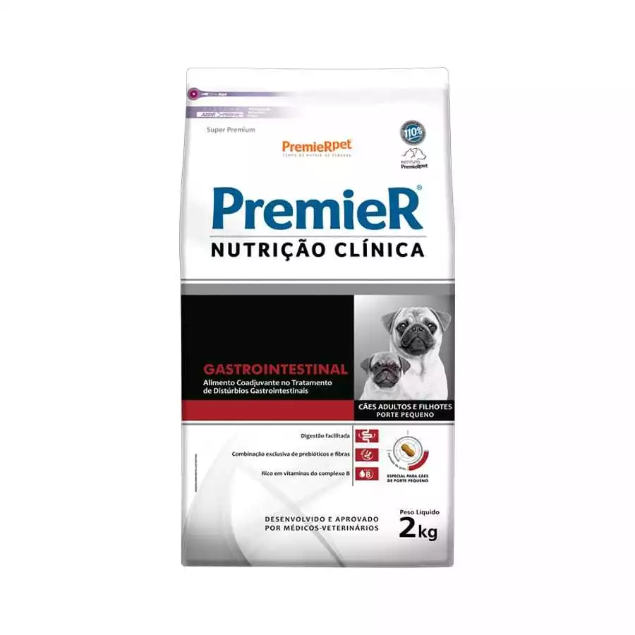A Ração Premier Nutrição Clínica Gastrointestinal para Cães Adultos Médio e Pequeno Porte é um alimento auxiliar no tratamento de alterações gastrointestinais em cães filhotes e adultos. Além do tratamento prescrito pelo médico veterinário, algumas alterações na alimentação podem ser benéficas para pacientes com alterações gastrointestinais. Os objetivos da dieta são: promover uma digestão facilitada, auxiliar na saúde intestinal através da combinação exclusiva de prebióticos e fibras, além de ser rico em vitaminas do complexo B para uma reposição adequada de nutrientes.